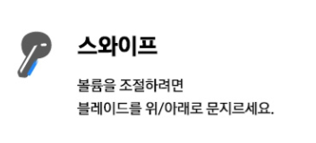 "스와이프 볼륨을 조절하려면 블레이드 후면을 위/아래로 문지르세요."