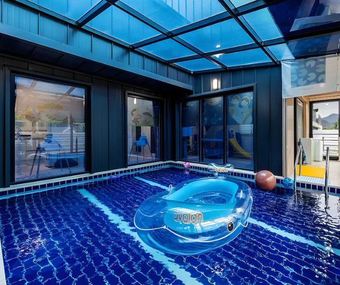드림 키즈 풀빌라의 가장 큰 매력은 바로 풀장이죠! 아이들이 안전하게 물놀이를 즐길 수 있도록 수심이 얕은 키즈 풀과 어른들을 위한 풀이 분리되어 있었어요. 튜브, 구명조끼 등 물놀이 용품도 무료로 대여해줘서 짐을 덜 수 있었답니다. 풀장 옆에는 선베드와 파라솔이 마련되어 있어 편안하게 휴식을 취할 수도 있었어요. 수영장 이용 시간은 오전부터 저녁까지 넉넉하니, 아이들과 신나는 물놀이를 즐겨보세요!